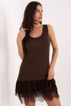 The dress with tulle and lace at the bottom is a feminine and stylish proposition for everyday wear, combining subtle elegance with comfort. Its flared cut beautifully accentuates the waist and gives the silhouette lightness, creating a delicately girlish effect. The model with a smooth, dominant pattern is made of a blend of polyester, viscose, and elastane, making it pleasant to the touch, elastic, and well-fitting on the body. The bottom is finished with tulle and lace, giving it a unique character and subtle decorativeness. The dress has a round neckline and thicker straps, ensuring comfort and stability during wear. Its knee-length makes it perfect for everyday styling. The lack of fastening makes it easy to put on and comfortable to use. It is a great choice for everyday occasions when you want to look stylish while feeling free and light throughout the day.