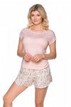 Two-piece pajamas with short sleeves. The chemise is made of smooth knitted fabric in the color of pastel pink with a striking cut on the back. The back of the shirt is decorated with patterned stripes. Short shorts made of printed knitted fabric with floral motif.