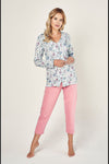 Women's pajamas with a comfortable cut, sewn from high-quality cotton. Button-down shirt with long sleeves. Complete with smooth fisherman type pants in solid color.