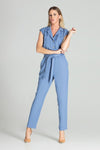 Blue jumpsuit with dropped shoulders, sleeveless. Cheese neckline with collar and lapels, button front fastening, patch pockets at bust level, slant pockets on trousers, slightly tapered legs, wide rubber band at waist, decorative tie belt.