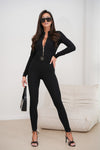 A fitted women's jumpsuit is a modern and stylish proposal for women who appreciate elegance with a hint of bold character. Made of high-quality material, it perfectly emphasizes the silhouette, providing comfort at the same time. Long sleeves and a front zip closure give it a dynamic and modern look. There is a decorative belt with snaps at the waist, which accentuates the waist and adds a unique expression to the whole. At the bottom of the legs, there are subtle zippers that not only facilitate adjustment but also give the jumpsuit an original accent. Perfect for evening outings, elegant meetings or special occasions, it combines femininity, style, and comfort.