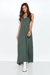 Long sleeveless dress is sewn from a pleasant to the touch knitwear. The dress has a classic cut, so it will look great on many female figures. The only decorative element of this dress is a delicate application sewn on the back, in the upper part. The dress beautifully exposes the back thanks to a strong cut in the shape of an inverted triangle. At the front, the neckline is slightly smaller, but still visible enough to emphasize the swan neck and delicate collarbones. The dress is slightly asymmetrical, slightly longer at the side. Wear this dress with your favorite sandals, reach for a small chain, and present class combined with refined femininity.