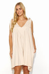 An airy dress with tied straps is an excellent choice for summer days, providing not only freedom of movement, but also comfortable to wear. Made from a fine sweatshirt knit, this dress will be perfect for warm days, providing a feeling of lightness and freshness. The deep V-shaped neckline on the front and back adds subtlety and feminine charm to the dress, emphasizing the neck and collarbones. An ornate gold plate located on the back line adds elegance and unique glamour to the creation. Available in several colors, this dress allows you to match different styles and occasions. Perfect for both a day at work and an evening out with friends. This dress will be your favorite choice for summer outings, guaranteeing you not only a fashionable look, but also comfort and freedom throughout the day.