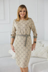 A very feminine and comfortable dress in shades of warm beige. Made of stretchy jacquard knit with elastane and lurex. Designed according to the principles of the LAAURORA brand, i.e. with mature women in mind. Kimono-style top with a drooping sleeve, belt for waist adjustment, muted color scheme, and soft and draping knit fabric weighing around 280 g/m2. All this makes the dress perfect for larger sizes.