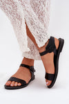 Women's sandals made of eco leather, set on a flat heel, are a classic choice for warm days. Fastened with a buckle with an adjustable strap, they guarantee a perfect fit to the foot. Their simple design perfectly complements flowing dresses and fabric trousers, creating an elegant and comfortable everyday look.