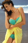 Lovely two-piece swimsuit with detachable brooch. One of the best this season! The bra is distinguished by a professional construction based on a well-known and popular bardot - thanks to that it lies perfectly and sensually lifts and shapes breasts. Enriched with underwires and specially designed for this model push up filling, it allows to enlarge breasts by almost two sizes - just put the filling into the bra and that's it! The wow effect is guaranteed. The filling is available in sizes S, M, L, XL. Slightly crinkled fabric at the neckline gives it an intriguing character, and a (detachable) brooch catches the eye. The bra is comfortably fastened on the back with a buckle and has an elastic girth. Adjustable straps, with the possibility of their complete detachment (ideal for sunbathing). Beautiful, saturated colors. Wonderful Italian knitwear. Classic briefs fit well and are very comfortable. Strap at the top.
