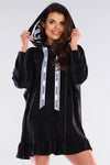 Oversized cut sweatshirt with a hood. Sweatshirt with a dress cut. Tapes with the company's logo and a frill at the bottom add charm to it. The inner side of the hood is made of fabric in letters. Product designed and manufactured in Poland.