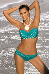 Big, trendy peas in cool colors this season. This is the perfect idea for the beach. The swimsuit features a sexy and very comfortable bra with a bardot design. The horizontal cut line allows for a sensual look and maximum elegance. Stiffened cups, enriched with underwiring (horizontal and vertical), supplemented with pockets for attached push up pads (available in sizes S, M, L, XL) - put them in the bra and your breasts will optically enlarge by more than a size. The construction additionally allows to perfectly lift breasts and bring them closer to each other. At the back the bra is fastened with a buckle. The straps of adjustable length, with the possibility of their complete detachment.