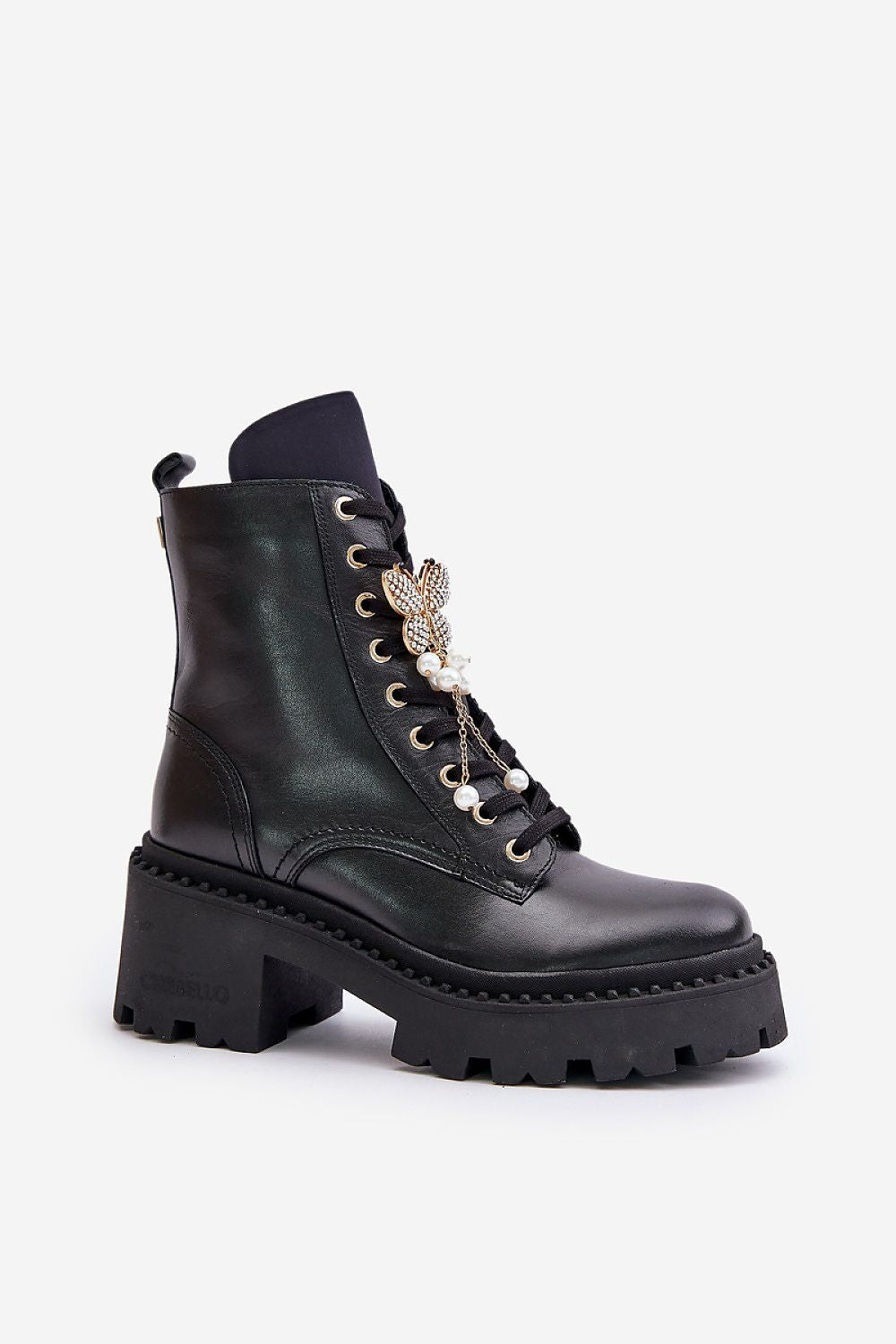 CheBello brand boots made of high quality natural leather. The interior is lightly insulated, which ensures the comfort of wearing on colder days. This model is distinguished by a charming pin in the form of a butterfly with beads. Rounded nose pads. You should definitely have them in your autumn-winter closet!