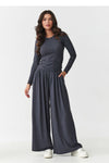 This set is the perfect proposal for women who are looking for a combination of comfort, style, and delicacy. Made of soft, pleasant to the touch viscose, it perfectly fits the silhouette, providing freedom of movement and comfort throughout the day. The top of the set is a fitted blouse with long sleeves, which stands out with subtle gathering on the sides. This feminine detail not only accentuates the waist, but also gives the whole an elegant, yet casual character. The combination of simplicity with a trendy detail makes the blouse not only perfect as part of the set, but also solo in many stylizations. Wide, loosely fitting trousers guarantee comfort and style in one. Thanks to the elastic waist and loose cut, they work great in movement, and the side pockets add functionality. This is the perfect style for wearing at home, as well as in street stylizations. The women's set is available in fashionable, universal colors: anthracite, black, chocolate, khaki, and burgundy. Choose comfort that goes hand in hand with a feminine look, choose a viscose set that will fit your lifestyle and silhouette.