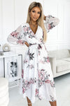 Chiffon midi dress with envelope neckline, long sleeves and belt. Dress in white with large roses. Brand numoco. European production.