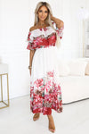 Discover the feminine charm and lightness with this unique Spanish-style maxi dress. The top decorated with a ruffle beautifully exposes the shoulders, and the airy bottom with a floral print creates an ombre effect and attracts attention. A comfortable elastic band is sewn at the waist, which adjusts to the silhouette and ensures comfort throughout the day. Perfect for holidays, garden parties, dates, or summer walks. Fall in love with the romantic style and opt for a dress that will make you feel special! European production.