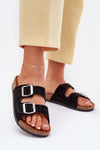 Women's sandals made of eco suede, set on a cork sole, are a comfortable and stylish option for warm days. Two straps with buckles allow for a perfect fit to the foot, and a contoured insole ensures comfort all day long. Perfect for everyday styling with dresses, skirts, and pants.