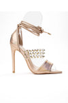 Sandals NOVARA in golden color are a spectacular proposal for women looking for unconventional accessories. The model attracts attention with a metallic finish imitating snake skin and a transparent strap embellished with golden studs. The ankle tie closure adds originality and allows for individual adjustment. The high stiletto heel emphasizes the silhouette, and the contoured insole ensures comfort. Sandals NOVARA are the perfect choice for evening outings, parties, or special occasions.