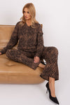 Casual women's set consisting of a blouse and pants. Sweatshirt of a looser cut with long sleeves and a heart-shaped neckline. Long pants with wider legs with an elastic band and binding at the waist.