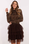 Tulle skirt with frills is an elegant proposition that will add lightness and feminine charm to any outfit. Made of high-quality polyester and viscose blend, it ensures comfort and beautifully drapes on the silhouette. The skirt has a smooth pattern and a mini length that accentuates the legs and gives the whole outfit a subtle yet distinctive character. Layers of tulle with delicate frills create a spectacular finish, perfect for special occasions such as parties, weddings, or evening outings. The model is equipped with a lining that guarantees comfort and provides full freedom of movement. The lack of fastening makes the skirt easy to put on and wear, and the elastic waistband (if present) further enhances comfort. It is a perfect choice for women who appreciate elegance in a fashionable way.