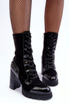 Women's boots made of a combination of eco leather and eco suede. Zipper closure on the inside of the upper. Lacing at the front. Heel in the form of a high post. Model with a higher upper. The center is insulated with shoe blanket. In addition, the heel counter is stiffened.