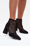 Women's ankle boots made of eco suede and mesh are a model created for special occasions. Pointed toes emphasize the feminine character of the shoes, and the column-shaped heel adds elegance and visually slims the silhouette. The zipper placed at the back of the upper ensures comfort when putting on and a modern look. The breathable mesh combined with delicate suede creates an original combination that fits perfectly into evening stylizations. These are perfect shoes for outings, meetings, or parties that will be a spectacular complement to an elegant outfit.