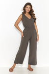 Women's knit jumpsuit that is sure to attract attention with its unique style. It features a drawstring waist, accentuating the feminine silhouette. The wide shoulder straps and flared 7/8-length legs add lightness and freedom, while the slip-in side pockets are a practical addition. It is an ideal choice for summer days, guaranteeing comfort and a fashionable look. Available in a diverse range of colors so that every woman can find her favorite shade. This suit is not only a style full of functionality, but also a reflection of current trends. Putting it on you will make any styling unforgettable. Wear it with comfortable sandals and go on vacation!