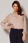Wunderschöne, langärmelige Bluse mit U-Boot-Ausschnitt. Der Ausschnitt ist mit einem dezenten Schlitz und einer Einfassung verziert. Ärmel und Saum sind mit einem Gummiband versehen.