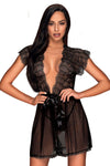 Abends hüllen Sie Ihren Körper in ein schwarzes, luftig-zartes Negligé und ein weiterer Teil eines gelungenen Tages steht bevor. Dieses Modell besticht durch zarte, unglaublich stilvolle Spitze mit wunderschönem Blättermuster. Die Taille wird durch eine Satinschleife und die Oberschenkel durch ein charmantes Mini-Ornament betont. String nicht im Lieferumfang enthalten.