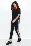 Leichtes und luftiges Damen-Sweatshirt-Set mit Kurzarmbluse. Ein perfektes Set für die Arbeit, einen Einkaufsbummel oder ein Treffen mit Freunden. Das übergroße Damen-Sweatshirt hat einen eng geschnittenen Rundhalsausschnitt, der die Schlüsselbeine freigibt. Dekorative goldene Bänder mit dem Wort „Numinou“ befinden sich auf beiden Seiten der Ärmel. Zum Set gehört auch eine Damen-Jogginghose mit eingenähtem Rippenmuster an den Beinenden und in der Taille. An den Seiten der Hose sind die erwähnten goldenen Bänder eingenäht, die eine Anspielung auf die erwähnte Bluse darstellen. An der Hüfte befinden sich seitliche Einschubtaschen. Die Strickware des Sets ist äußerst angenehm zu tragen.