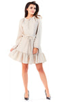 Langärmliges Kleid in Beige. Dekorative Rüsche am unteren Saum. Dekorative Schleife am Ausschnitt und an der Taille.