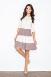 Ein Kleid mit 3/4-Ärmeln und horizontalen Streifen in Kontrastfarben. Sehr feminin, perfekt für jeden Tag.