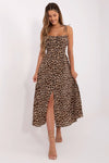 Stilvolles und bequemes Kleid für jeden Tag mit femininem, ausgestelltem Schnitt. Midi-Modell mit rechteckigem Ausschnitt und gebundenen Trägern für eine perfekte Passform und hohen Tragekomfort. Die Korsett-Taille betont die Silhouette wunderschön, und die eingenähten, gepolsterten Cups bieten zusätzlichen Halt für die Brust, sodass das Kleid auch ohne BH getragen werden kann. Die Rüschen auf der Rückseite verleihen dem Kleid nicht nur Charme, sondern erhöhen auch die Flexibilität und den Tragekomfort. Der Knopfverschluss auf der Vorderseite verleiht dem Kleid einen mädchenhaften Charakter und erleichtert das Anziehen. Der trendige Animalprint macht das Kleid zu einem Hingucker und liegt voll im Trend. Hergestellt aus atmungsaktivem Material, einer Mischung aus Polyester und Elasthan, die Bewegungsfreiheit und eine perfekte Passform gewährleistet. Eine großartige Wahl für alltägliche Ausflüge, Treffen mit Freunden oder entspannte Sommerspaziergänge – wann immer Sie stilvoll aussehen und sich gleichzeitig wohlfühlen möchten.