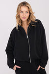 This casual women's sweatshirt is the perfect choice for everyday, comfortable stylizations. Made of a combination of polyester, viscose, and elastane, it provides softness, elasticity, and comfort of wearing. The model of standard length has long sleeves and a practical stand-up collar, which adds sporty elegance and protects against cold. The sweatshirt is fastened with a zipper, which makes it easy to put on and allows you to adjust the level of comfort. The smooth material gives it a universal character, and the slip pockets increase functionality and make it perfect for everyday wear. It is a timeless wardrobe essential that you can easily pair with jeans, leggings, or sweatpants.