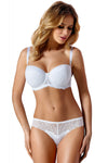 Schönes BH-Modell mit gepolsterten Cups im Balconette-Schnitt. Nahtlose Cups aus elastischer Mikrofaser, teilweise mit Spitze überzogen. Bügel-Modell. Seiten und Steg aus Spitze. Abnehmbare Träger mit verstellbarer Länge. Der Balconette-Schnitt formt die Brust schön und rundet sie ab. Seiten und Rücken aus glattem Strickstoff. Kleine Verzierung zwischen den Cups. Modell innen mit Silikonband versehen. Dreireihiger Verschluss mit zwei Häkchen.