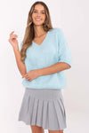 Stilvoller Damenpullover mit lässigem Charakter, perfekt für Alltag und Arbeit. Hergestellt aus einer hochwertigen Mischung aus Acryl, Wolle (Lana), Viskose und Polyamid bietet er Weichheit, Komfort und Strapazierfähigkeit. Das glatte Muster verleiht ihm einen eleganten, minimalistischen Look, der sowohl zu Jeans als auch zu formelleren Hosen oder Röcken passt. Die kurzen Ärmel und der V-Ausschnitt betonen den femininen Charakter des Pullovers und machen ihn zu einer großartigen Wahl für verschiedene Anlässe. Die Standardlänge ermöglicht viele Stylings. Ein ideales Angebot für Frauen, die Komfort und zeitlose Eleganz schätzen.