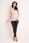 Bluse mit kurzen Ärmeln und Rüsche unten. Bluse aus rosa Stoff mit Vögeln.