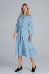 Maxikleid mit tailliertem Schnitt und Gummizug. Der untere Teil des Kleides ist mit einer Rüsche ausgestellt, der V-Ausschnitt mit Revers ist halb geknöpft. 7/8-Ärmel mit Schärpe gebunden, seitlicher Reißverschluss.