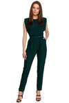 Overall statt Kleid? Ja, immer dann, wenn man besonders aussehen und sich wohlfühlen möchte. Ein solcher Overall aus leicht glänzendem Stoff mit lockerem, ärmellosem Oberteil mit Schulterpolstern und einer Hose mit leicht schmal zulaufendem Bein, die in der Taille mit Gürtel und Schnalle gerafft ist, ist der Hammer! Geschlossen wird der Anzug mit einem verdeckten Reißverschluss.