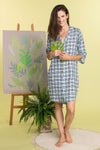 Camisón de cuadros para mujer con cuello. Corte holgado y cómodo, con espalda ligeramente alargada y abotonado. Mangas de 2,35 cm con lazos para ajustar el largo.