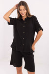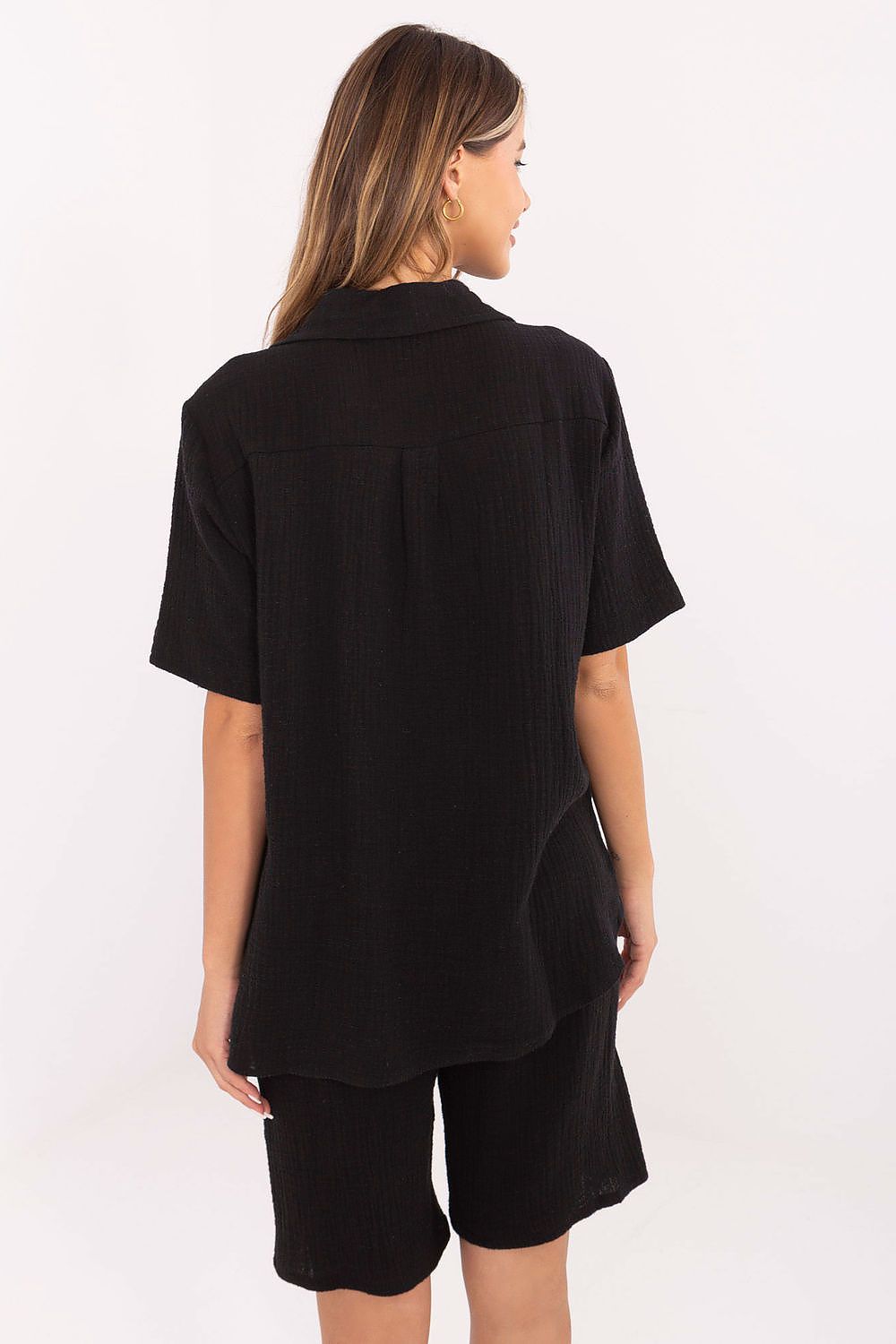 Light muslin set consisting of a shirt and shorts is an ideal proposition for warm, everyday days. Made of pleasant to the touch, breathable cotton, it provides maximum comfort and freedom of movement. Smooth material emphasizes the minimalist, casual style of the set. The short-sleeved shirt with a collar and button fastening looks elegant and modern, and an additional tie belt allows you to emphasize the waist and give the silhouette a feminine shape. Shorts with straight legs and a high waist are equipped with practical, side slip pockets. The set will be perfect for everyday wear, for a walk, shopping or meeting friends.