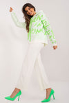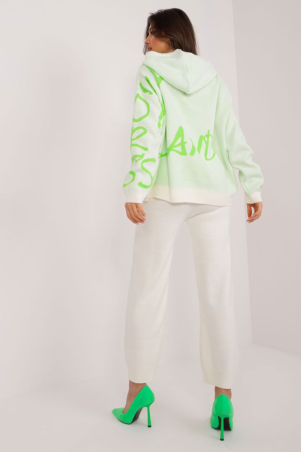 Un conjunto compuesto por un suéter con un estampado colorido y un pantalón, confeccionado en una suave mezcla de acrílico y lana. El suéter tiene mangas largas y capucha, combinando un estilo elegante con funcionalidad, ideal para el día a día. Los pantalones de pernera recta tienen un cómodo lazo en la cintura que garantiza comodidad y ajuste. Su largo estándar lo hace versátil e ideal para salidas diarias, combinando un estilo casual con un diseño moderno y llamativo.