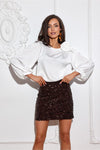 This shimmering mini skirt attracts attention with its elegant shine and precise craftsmanship, which emphasizes its high quality and Polish production. It perfectly accentuates the silhouette, giving the styling a modern, evening character. The model decorated with sequins, fastened with a zipper, lined with lining, goes well with a smooth blouse or fitted bodysuit and heels, making it an ideal choice for a party, a festive outing, or an elegant dinner.