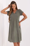 This summer, flared dress is the perfect choice for everyday comfortable, feminine, and versatile styling. Made from a blend of cotton and elastane, it provides breathability and flexibility, making it perfectly fit the silhouette. The upper part of the dress is made of ribbed material, which gently emphasizes the shapes and adds subtle structure to the whole. The smooth pattern gives the dress a classic, minimalist character, easy to style in many ways. A model knee-length, with short sleeves and a V-neckline, beautifully highlights the neck and optically slims the silhouette. An additional advantage are practical pockets hidden in the side seams, perfect for small items or simply for convenience. This is an excellent dress for summer days light, comfortable, and stylish, suitable for walks, meetings with friends, as well as everyday duties.