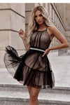 Elegant tulle dress with straps and adjustable tie. Dress fastened with a hidden zipper. Decorative belt for tying at the waist. Slightly flared bottom.