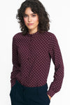 Otra propuesta otoñal es una camisa abotonada de corte sencillo con mangas largas, terminadas con puños y cuello alto en un encantador estampado de guisantes. Combina a la perfección con trajes de diversos colores y es la base perfecta para un estilo formal. Además, su tejido 100 % viscosa te hará sentir cómoda durante todo el día.