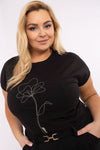 Women's plus size casual blouse is a perfect choice for everyday wear and work. Made of soft cotton with a hint of elastane, it provides comfort, breathability, and a slight fit to the silhouette. The model is of standard length, with short sleeves and a classic, round neckline. The bottom of the blouse is finished with a practical ribbing, which gives the whole a modern look and allows for a better fit to the figure. On the front, there is a subtle flower-shaped application that adds a feminine charm and delicate elegance to the blouse. Perfect for both jeans and fabric pants or skirts, great for everyday wear and work.