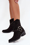Cowboy boots made of eco suede are a trendy everyday proposition. Set on a low heel, they guarantee comfort, and almond toes add a subtle elegance to them. Attention is drawn to the decorative straps on the side of the upper embellished with a silver element, which give the whole a characteristic, cowboy style. This is a versatile model that will work great in casual stylizations, adding a fashionable accent to them.