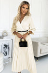 Vestido plisado Serena con escote, cinturón negro y mangas 3/4, confeccionado en tela verde lisa. Un vestido perfecto para cualquier ocasión. Marca numoco basic. Fabricación europea.