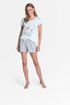 Las flores son un motivo sutil y atemporal que combina de maravilla con colores pastel. Este pijama combina esos encantadores motivos románticos con colores sutiles, ideal para la noche. Tejido de algodón agradable al tacto. Pantalón corto elástico con cinta decorativa en la cintura y camiseta estampada en el centro.
