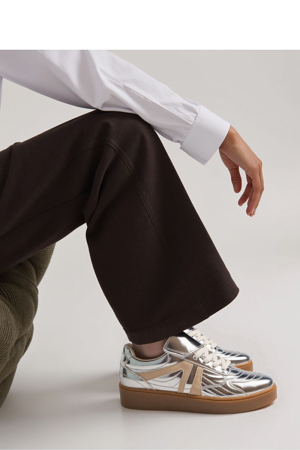 XERON sneakers in silver, metallic finish are a proposal for women who appreciate modern style and comfort. Their futuristic design catches the eye, and the contrasting beige insert adds a unique character to them. The rubber sole in a caramel shade provides stability and comfort for everyday wear. Ideal for both casual and bolder stylizations. Material: Upper: Synthetic leather (metallic) + fabric Interior: Textile material Sole: Synthetic material