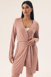 Light and feminine women's dressing gown made of delicate, smooth viscose that envelops the body and provides exceptional comfort when worn. A model that reaches just below the knee, with long sleeves and a loose cut that does not restrict movement. The belt tie allows for a perfect fit to the silhouette. A dressing gown perfect for every season. Packaged in a convenient plastic bag, it also makes a great gift.