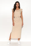 A long, extremely elegant dress sewn from a lightweight sweatshirt knit. It has a round neckline and short sleeves with padding. The dress reaches to the lower part of the calf. The practical slit looks great and makes the dress comfortable and suitable for many circumstances. Therefore, you can wear sports shoes with it and go for a walk. Nothing prevents you from wearing to it also delicate sandals or stilettos. The belt attached to the dress sensationally emphasizes the slim waist. The smooth material makes the casual creation an extremely versatile fashion choice.