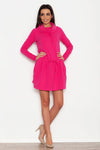 Dress with loose turtleneck. Long sleeve flared skirt. At the turtleneck and at the waist decorative strings for adjustment.